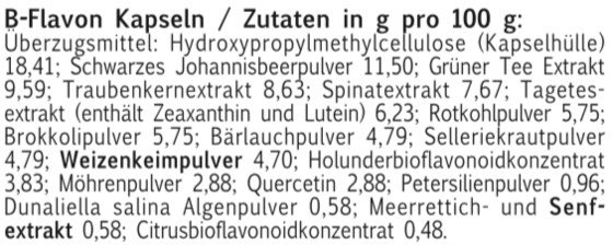 Schwarzes Johannisbeerpulver Grüner Tee Extrakt Traubenkernextrakt Spinatextrakt Tagetesextrakt, davon 5 % Zeaxanthin, 20 % Lutein Rotkohlpulver Brokkolipulver Bärlauchpulver Selleriekrautpulver Weizenkeimpulver Holunderbioflavonoidkonzentrat Möhrenpulver Quercetin Petersilienpulver Dunaliella salina darin enthalten Vitamin A Meerrettich- & Senfextrakt Citrusbioflavonoidkonzentrat