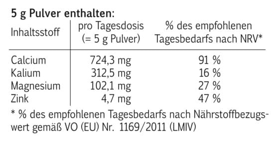 • Zink - trägt zu einem normalen Säure-Basen-Stoffwechsel bei.