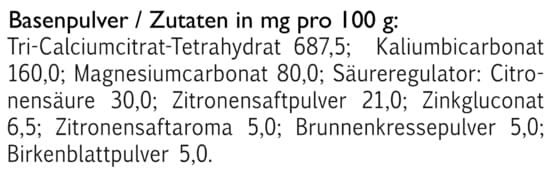 • 1 x täglich einen gestrichenen Messlöffel á 5 g Basenpulver in mindestens 150 ml Wasser auflösen und trinken (Messlöffel enthalten)